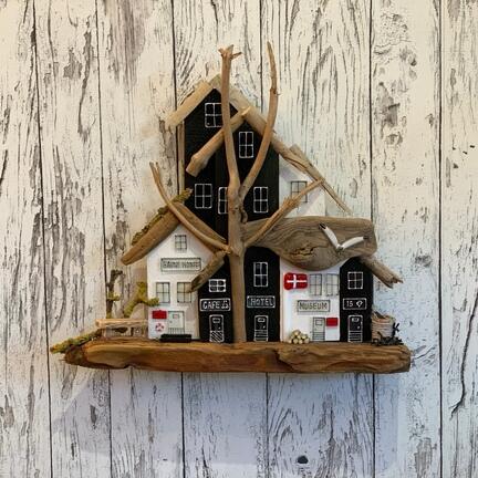 Skøn landsby lavet med drivtømmer og hvor jeg har lavet små døre og vinduer i glas. Meget dekorativ at have hængende og alle mine værker kan hænge ude hele året. De giver skøn og hyggelig udemiljø. Den måler: 36x39 cm.