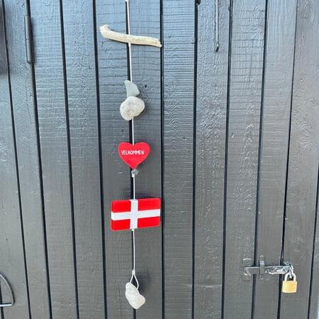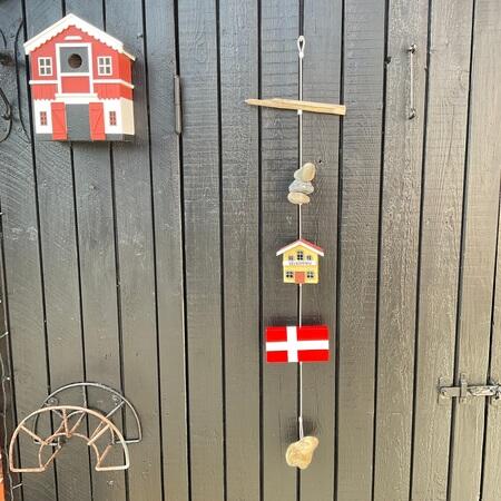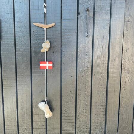 Hier sind verschiedene Holzflaggen zu sehen. Alle sind auf einer Schnur mit Steinen und Treibholz vom Strand. Flagline ist ein beliebtes Geschenk. Sie werden auch als Steinranken bezeichnet. Hohlrunde Steine und Treibholz, die an den Stränden von Skagen gesammelt wurden. Die hohlen Steine werden auch als Kø'er bezeichnet. Aufhängen von Flaggen und Steinen für das Ferienhaus. Auch für Wohnwagen geeignet. Viele Menschen gehen mit gesenktem Kopf an den Stränden um Skagen und suchen nach hohlen Steinen. Handgemalte Flaggen und lokale Steine und Treibholz. Einige nennen sie Sommerhaus-Flaggen.