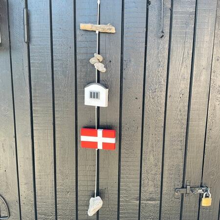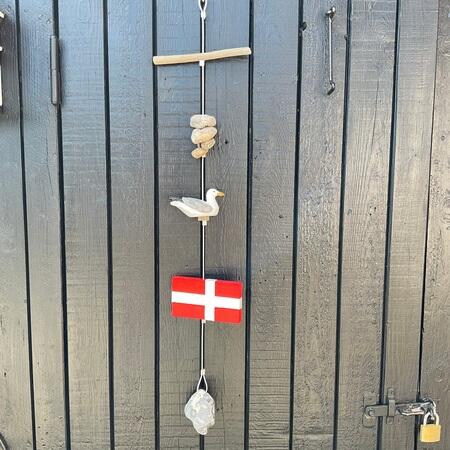 Her ses forskellige træ flag. Alle er på snor med sten og drivtømmer fra stranden. Flagline er populær gaveidé. De omtales også som stenranker. Hulsten og drivtømmer samlet på strandene i Skagen. Hulsten kaldes også for kø`er. Ophæng med flag og sten til sommerhuset. Også fine ved campingvogne. Du ser mange der går med hovedet ned på strandene omkring Skagen og kigger efter hul sten. Håndmalet flag og lokale sten og drivtømmer. Nogle kalder dem sommerhus flag.