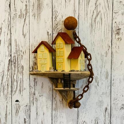 Skøn lille by med gule huse. Sammen med det smukke drivtømmer og den rustne kæd og kugle på toppen er den virkelig dekorativ. Den måler: 34x26 cm.