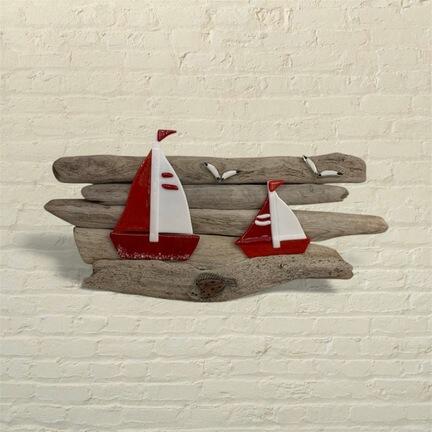 De smukkeste røde sejlskibe er her påsat de fineste drivtømmer pinde som er sat sammen. Den måler: 43x21 cm.