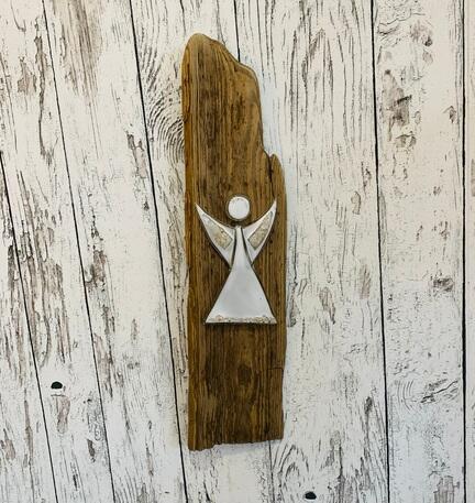 Smuk smuk lille engel i glas med lidt guld på vinger og kjole. Englen måler: 13x8 cm. og hele værket måler: 41x10 cm.