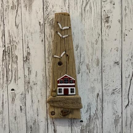 Skøn drivtømmer pind, hvor jeg har monteret et af mine fine fiskepakhuse i glas. Og så lige nogen små glas måger og nederst en rødspætte. Den måler: 41x13 cm