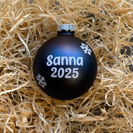 Kugler til 40, er med et navn, og årstal.Her ser du mat blå. Ønsker du navn og årstal vælger du kugle til kr. 40,-
