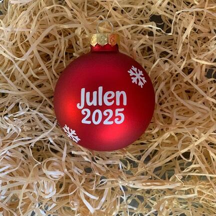 Kugler til 40,-er med et navn, og årstal.Her ser du mat rød. Ønsker du navn og et årstal vælger du denne kugle til kr.40,-