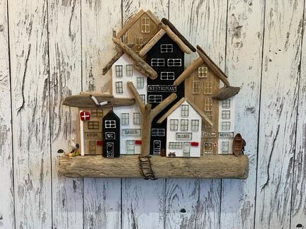 Her har jeg lavet fantastisk landsby, som er holdt i de sorte og hvide farver. Mange fine små detaljer. Den lille jolle er sat på land, men skulle nogen af hotellets gæster ønske sig en ro tur, kan den hurtigt komme i vandet🤩 Byen måler: 35x40 cm.