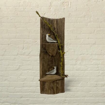 Her er 2 af mine smukke glas måger monteret på fint stykke drivtømmer. De er meget fine at have hængende og skabe hygge og miljø både ude og inde. Den måler: 36x14 cm.