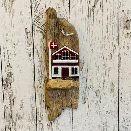 Skagenshus i glas på drivtømmer.