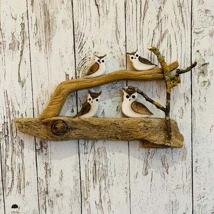 Fine små træ ugler sidder og hygger på smukt drivtømmer. Den måler: 35x21 cm.